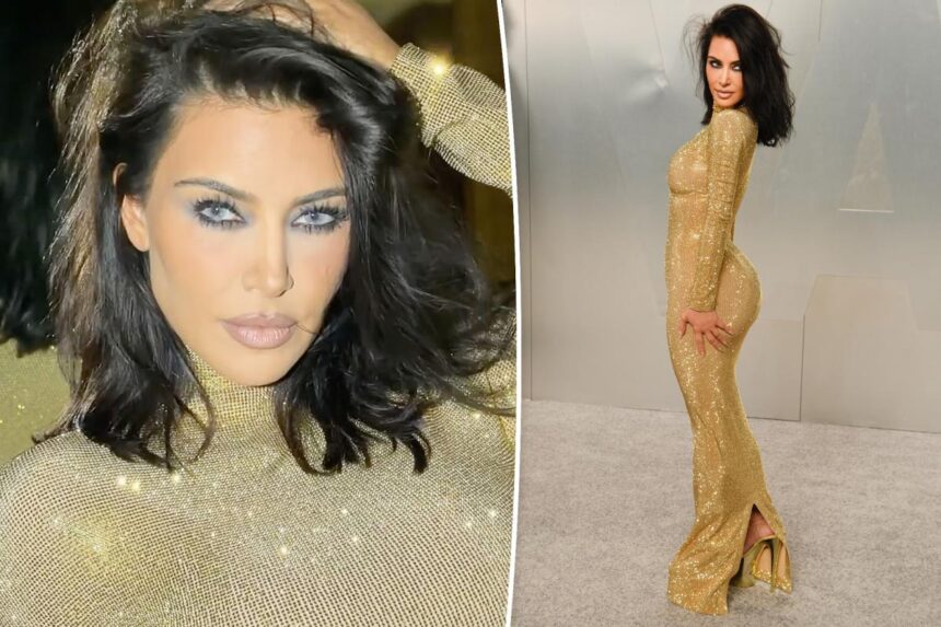 Kim Kardashian went for the gold Sunday night. The Skims mogul, 45, hit the Vanity Fair Oscar Party 2026 red carpet wearing a glittering Gucci gown paired with 8-inch heels…