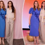The look in question was an ensemble comprised of a pair of vibrant pink trousers, which she paired with a striking orange knitted capped sleeve top, completing her outfit with Barbie pink suede pointed-toe heels.Â