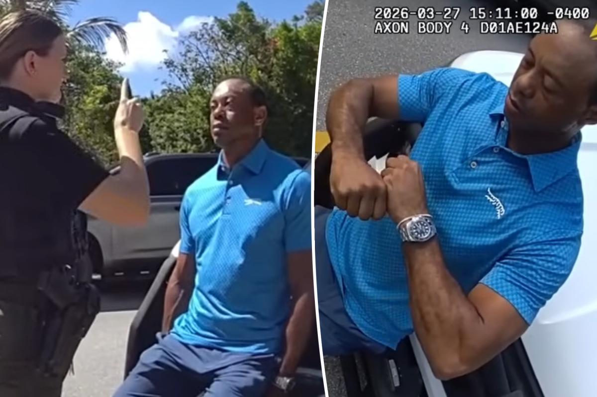 The footage – which was one of several new videos released from the day of the golf great’s rollover crash and arrest in Jupiter Hills, Florida, last week – begins with an officer asking Woods to remove his hat and sunglasses.