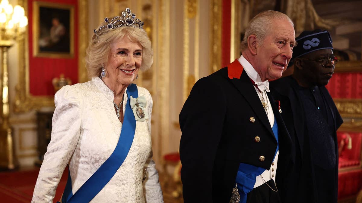 The King and Prince both wore white tie and Windsor tailcoats with their orders, medals and Garter sashes. William walked with Ambassador Bianca Odumegwu-Ojukwu, who sat to his right at the banquet, while Kate walked with Nigeria’s Minister of Finance, Adebayo Olawale Edun, who also sat to her right.